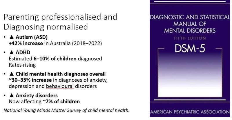 I'm not saying there aren't genuine cases of autism from birth, or that there may be factors not yet substantiated that have contributed to a jump in autism-like symptoms. However, the extent of this inflation points to more social, relational environmental factors -- in both families and society. (And yes - this applies to other children's mental health diagnoses.) Dr. Murray Bowen noted that a projection process can contribute to the development and maintenance of symptoms in children. There is ample research literature to support this. And a growing number of credentialled voices to raise the alarm - i.e., Allen Frances, an American psychiatrist who was Chair of the DSM-IV task force, & who writes about the medicalisation of normal behaviour; and UK psychiatrists Uta Frith and Dr Sami Timimi, who criticise overdiagnosis and the medicalisation of childhood. The neurodiversity movement started in the late 1990's, the decade where society poured massive attention to analysing our brains. Timimi writes: "No unique, characteristic, and reliable findings in genetic, neuroanatomical, neurofunctional, or neurochemical investigations have been discovered. This is why all assessments for conditions like ADHD and autism rely on subjective interpretations drawn from things like questionnaires or observations."